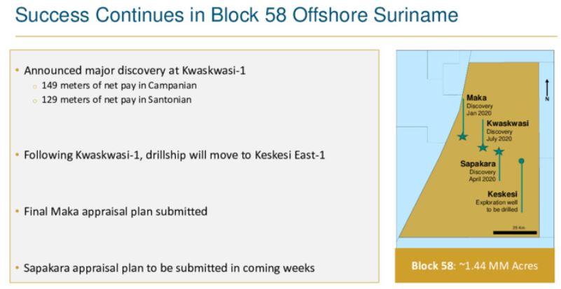 Kwaskwasi-1 discovered hydrocarbons in multiple stacked targets in the upper Cretaceous-aged Campanian and Santonian intervals. The well encountered 278 meters (912 feet) of net oil and volatile oil/gas condensate pay. The shallower Campanian interval contains 63 meters (207 feet) of net oil pay and 86 meters (282 feet) of net volatile oil/gas condensate pay. The Santonian interval contains 129 meters (423 feet) of net pay. Fluid samples from the Campanian validated the presence of oil with API gravities between 34 and 43 degrees.