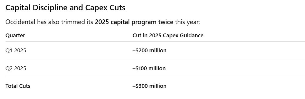 OxyChem has been a steady cash generator, contributing $185 million of pre-tax income in Q1 2025 and $213 million in Q2. The unit provides counter-cyclical ballast to Oxy’s upstream-heavy portfolio, smoothing earnings when commodity prices weaken.