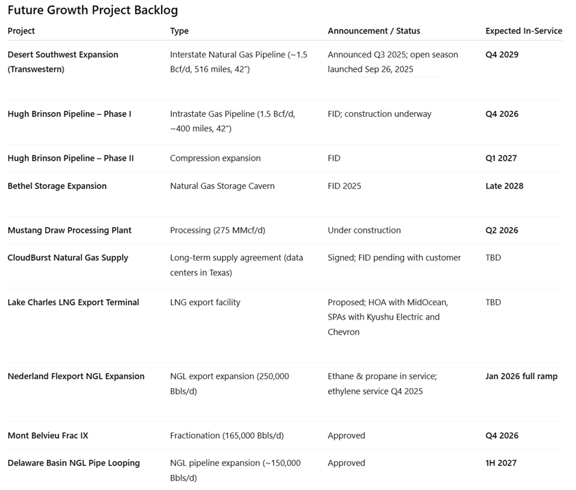 The Desert Southwest Expansion provides a new long-haul natural gas corridor, strengthening Energy Transfer’s interstate network while addressing rising power demand, population growth, and data center development in the region. It positions Transwestern as a critical link between Permian supply growth and the energy needs of utilities and industrial consumers in Arizona and New Mexico.