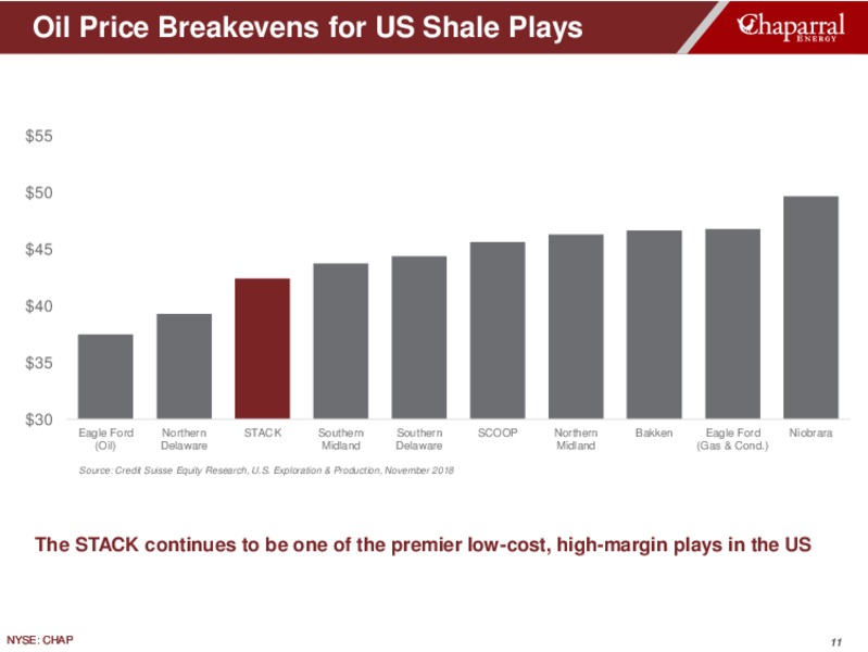 Oil Price Breakevens for US Shale Plays 55 50 45 40 35 30 Eagle Ford Northern STACK Southern Southern SCOOP Northern Bakken Eagle Ford Niobrara (Oil) Delaware Midland Delaware Midland (Gas & Cond.) Source: Credit Suisse Equity Research, U.S. Exploration & Production, November 2018 The STACK continues to be one of the premier low-cost, high-margin plays in the US NYSE: CHAP 11